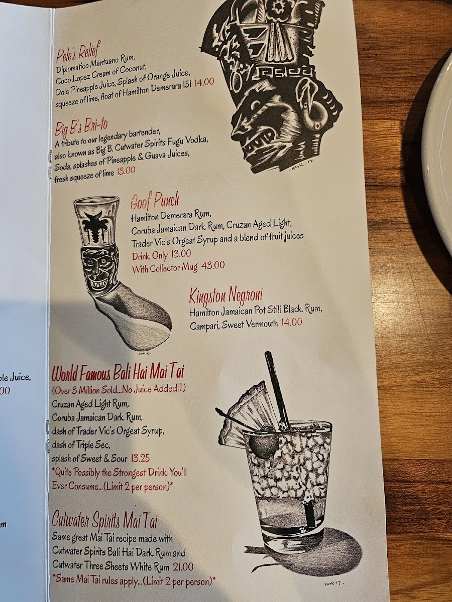 Alongside flavorful dishes, the drink offerings add to the laid-back vibe, with cocktails crafted from time-tested recipes including their well-loved Mai Tai. These drinks encourage leisurely moments spent soaking in the iconic bay views and the warm Polynesian ambiance.
